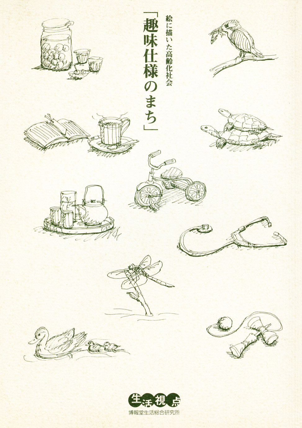 ハッピーな高齢化社会のまちを空想し、絵に描いた提言リポート「趣味仕様のまち」。そのまちにはどんな道があって、どんな交通機関が走り、通りには、どんなお店や住宅が並んでいるでしょうか。未来のまちを訪ね歩きスケッチをする…そんな作業でした。そして素敵なアイデアが沢山生まれ、思い出に残る仕事になりました。
