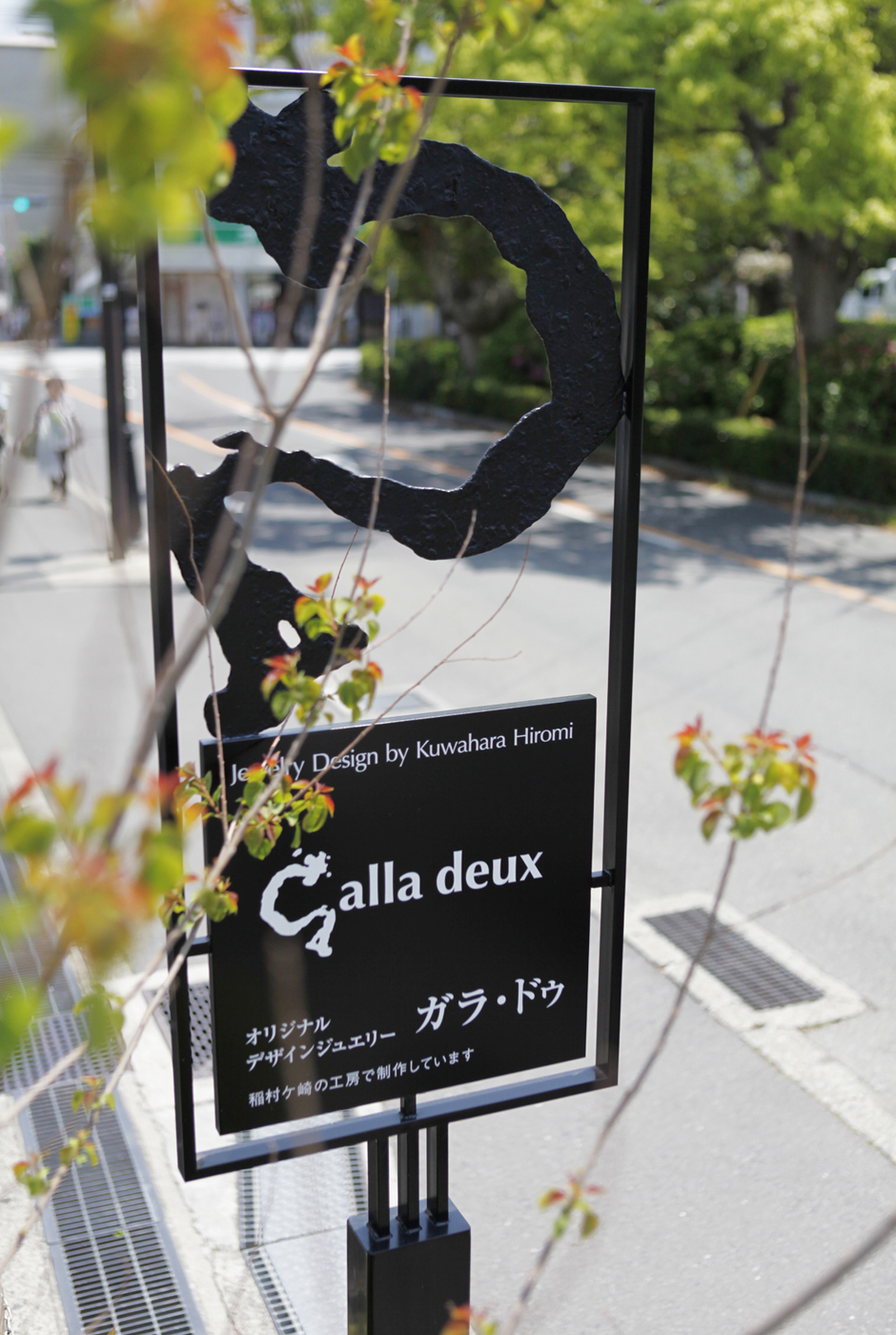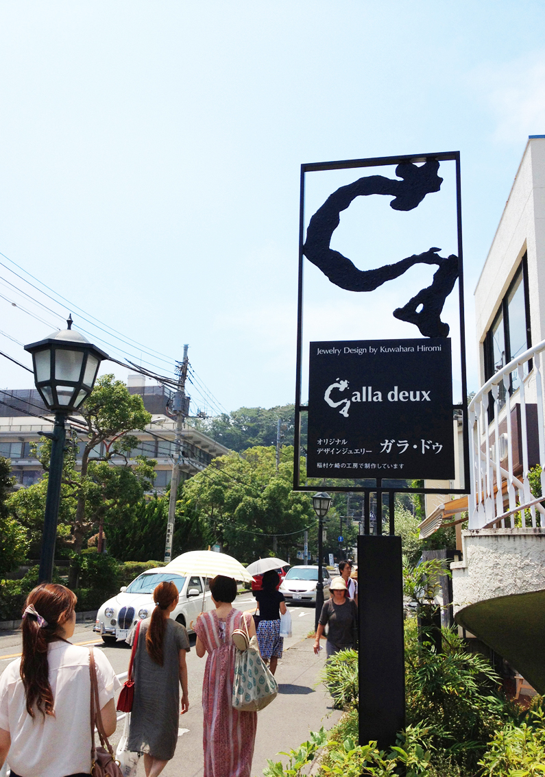 シンボルサインです。ショップロゴの頭文字「G」を、鉄の彫刻家の方に表情をつけてもらいました。もっと日本の個店などでも、コンセプトや思いを表現した独自のサインデザインにトライしてみてはいかがでしょうか。